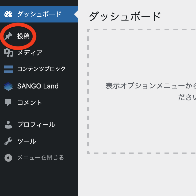 ダッシュボード左側にあるメニュー項目から「投稿」をクリックします。
