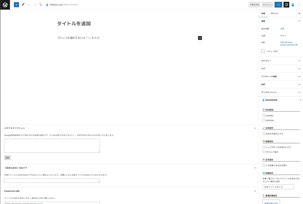 投稿画面「タイトルを追加」と表示された箇所をクリックすると入力モードになり、文字入力が可能になります。記事のタイトルを入力してください。